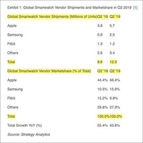 喬布斯的“蘋果”自問世以來,倍受爭議。盡管iphone的營業收入水平近些年來呈下滑趨勢,但是蘋果可穿戴設備業務卻迎來爆發。Strategy Analytics高級分析師Steven Waltzer表示,“全球智能手表出貨量從2018年Q2的860萬到2019年Q2的1230萬同比增長44%.智能手表增長繼續飆升,這是由于消費者越來越多的使用以健身為主導的可穿戴設備來作為他們智能手機的附件。”蘋果(AAPL.US)以46.4%的市場占有率仍然穩居榜首.