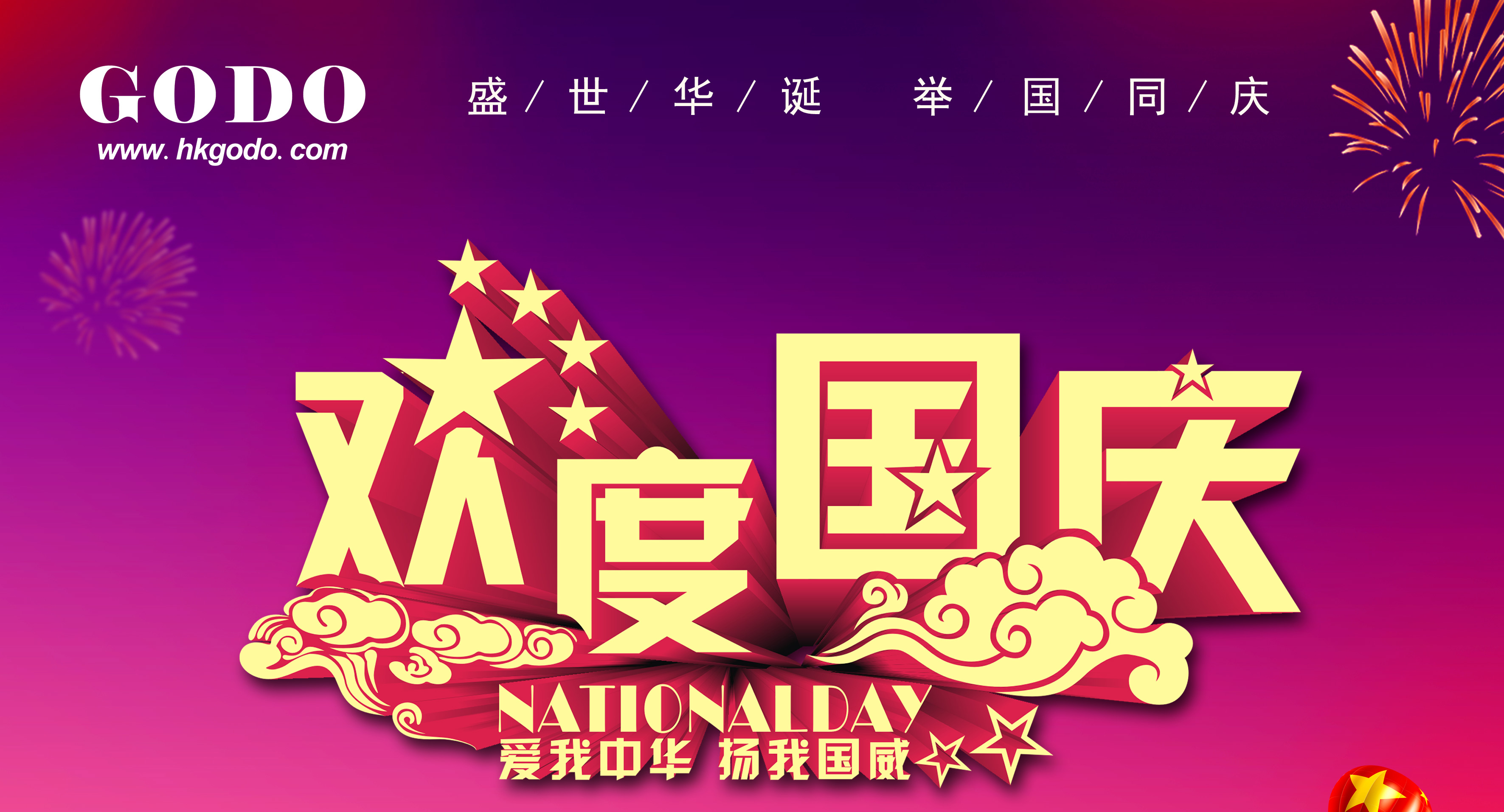 值此十一佳節之際GODO--祝福:祖國母親70周年華誕,愿祖國永遠富強進步,繁榮昌盛。祝福您:國慶、家慶,普天同慶;    人緣、福緣,緣緣不斷;    情愿、心愿,愿愿隨心。    國慶快樂!